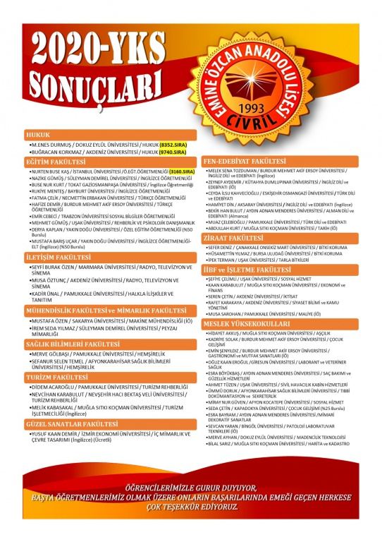 Üniversite başarımız %50 iken, 3 öğrencimiz ilk 10.000 girdi. Ayrıca geçen seneki mezunlarımızdan Aybüke ÖNER İstanbul Üniversitesi -Psikoloji bölümüne giderken, Abdullah Aksoy ise Dokuz Eylül Üniversitesi Psikoloji bölümünü kazandı.